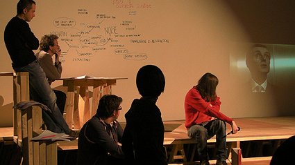 The workshop involved group discussions, collective writing sessions as well as daily public addresses in the form of exposés, conversations, performances and presentations of material (newspaper texts, sociological essays, etc) and artists works. The latter are chosen through a first, open, reflection about artworks that could be situated in the legacy of Kraus, in the sense that they use the same creative modes as Kraus; namely a). indignation b). literality, and the use of "acoustic quotes" c). the sense of absolute responsibility. These works include pieces by Paul Chan, Guy Debord, Stephan Dillemuth, Andrea Fraser, Andrea Geyer, Melanie Gilligan, Sharon Hayes, Ashley Hunt, Nils Norman, Katya Sander, Joe Scanlan, Christoph Schlingensief, Alain Séchas, David Thorne, and René Vienet, among others.