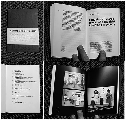 Calling out of Context is a book published by Paraguay Press. The book foregrounds specific types of transdisciplinary work and working economies that are situated at the intersection between theatre and visual art. The book is an anthology of texts assembled in a quasi linear historic timeline based on the research I conducted at the Danish School of Performing Arts from 2014 to 2016. For more information about the research read here. But ultimately, the publication looks toward the future, and aims to be a source of inspiration for coming practitioners, students and curious minds.