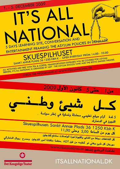 IT'S ALL NATIONAL is a 5 day event, from the 1st – 5th of December, 2009 organized by Asylum Dialog Tank (ADT) and Joachim Hamou as part of the Temporary National Theatre (TNT) project hosted at the Royal Danish Theatre.