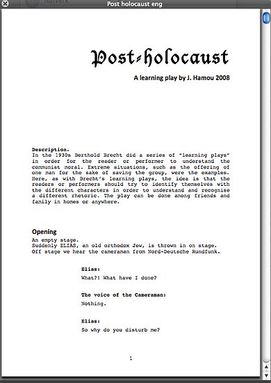 Here, as with Brecht’s learning plays, the idea is that the readers or performers will end up identifying with the different characters in order to understand and recognize a different rhetoric. The play can be done among friends and family in homes or anywhere. (Read/download)